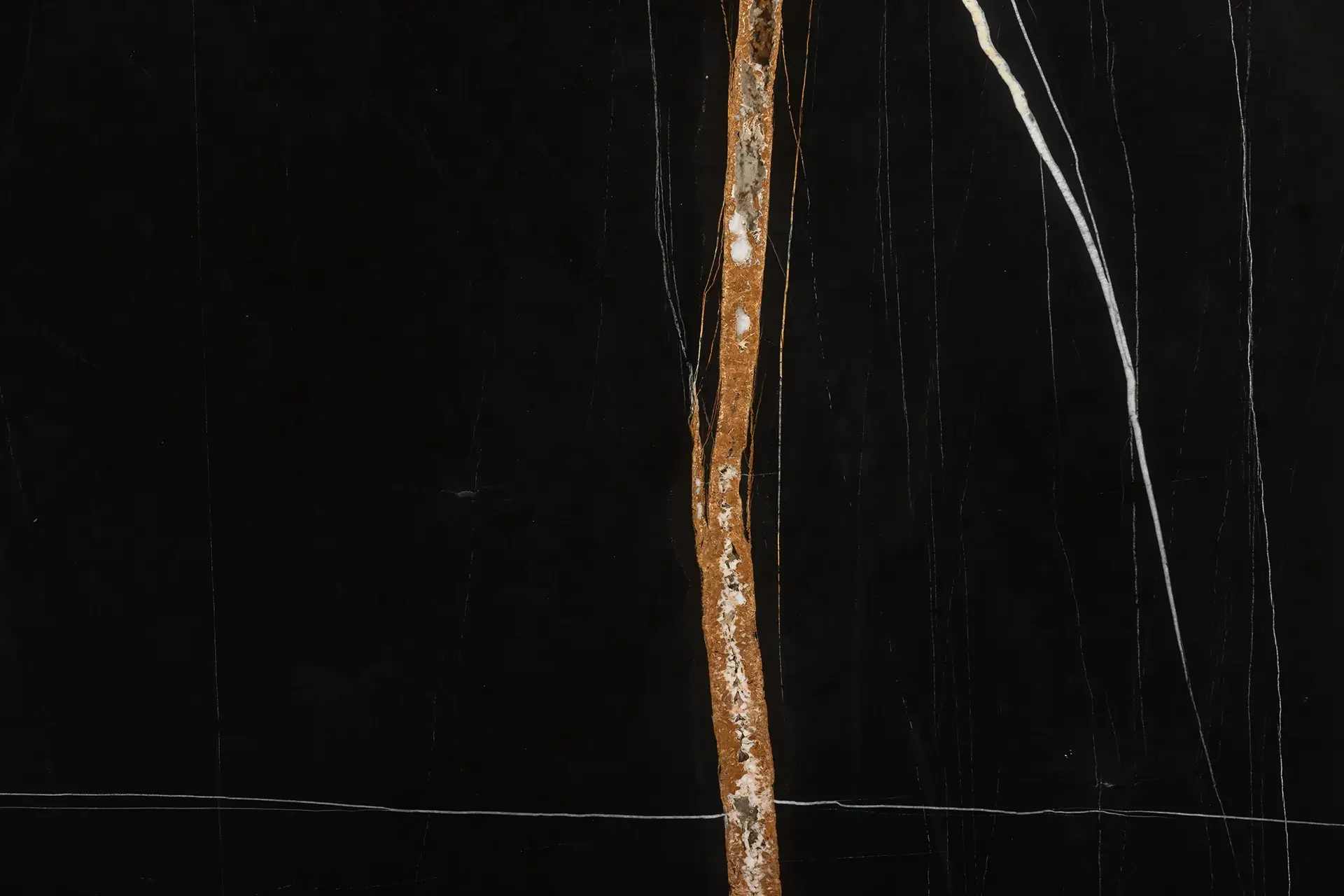 Mármore negro profundo exibe um contraste visual impressionante: veios delicadamente entrelaçados em tons dourados, brancos e castanhos que evocam as paisagens em movimento do deserto. Combina perfeitamente com ambientes que exigem presença e distinção, bancadas, paredes de destaque, revestimentos de chão ou lavatórios, Transforma cada superfície num ponto focal de luxo e modernidade.